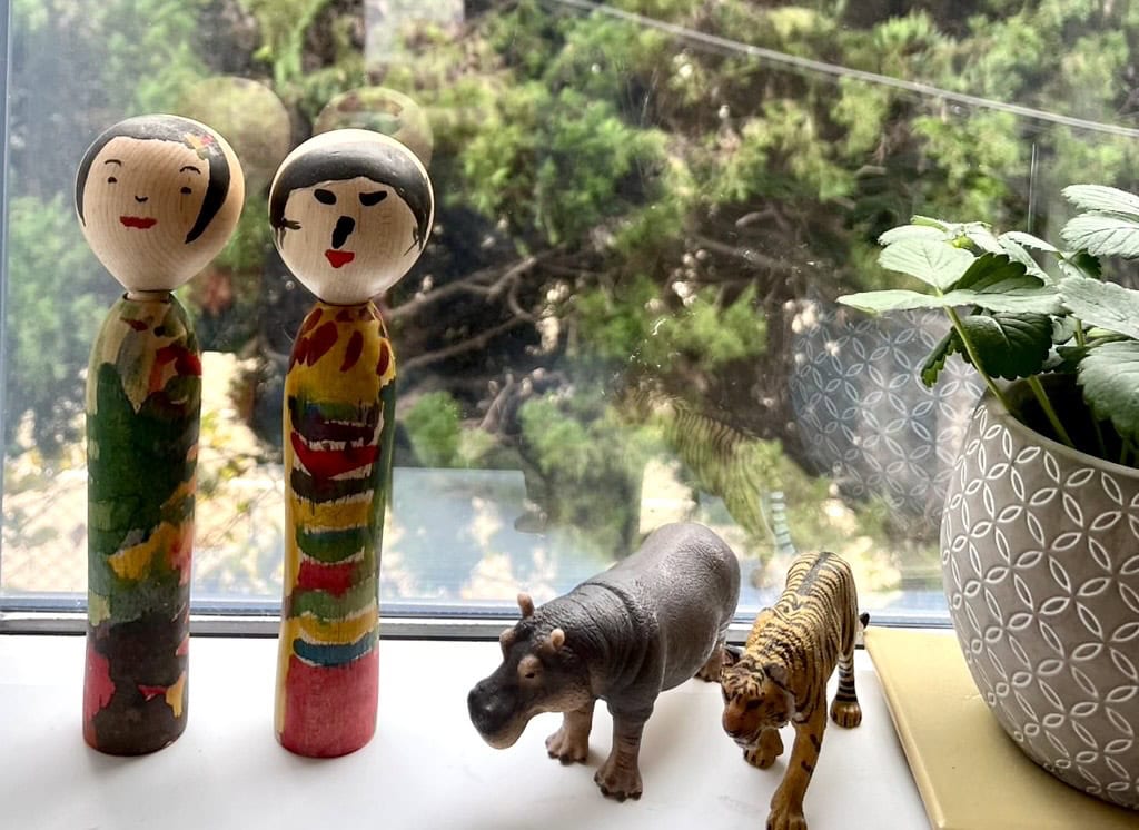 個性的に仕上がった2体のこけし。窓辺に飾っているのですが、みると親子で絵付けをした時間がふっとよみがえり笑顔になれます。