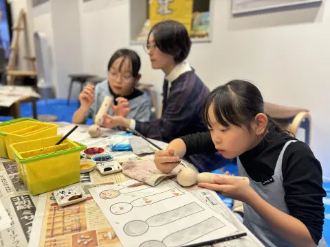昨年も開催されたこのイベント。筆者も小学1年生の息子、3歳の娘と一緒に参加しました。球体の顔に筆を入れる瞬間はドキドキ。「むずかしい〜!」と言いながら、親子で夢中になって取り組みました。