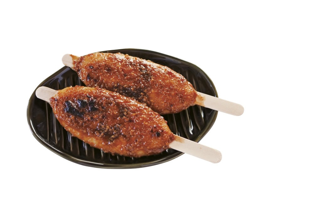 ま、ピーナッツが入った甘辛だれ。つけて焼くと香ばしい味わいに。キャンプなどで炭火で焼くのも楽しい。