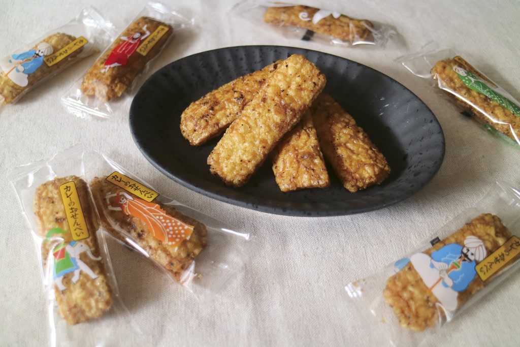 米と水にこだわった米菓を製造する美鹿山荘の人気商品。カラッと揚げたおせんべいを和風仕立てのカレーだれに漬け込み、ブラック