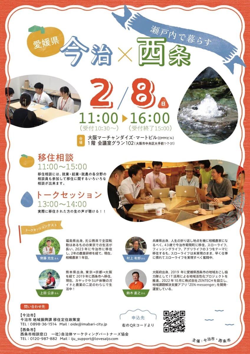 愛媛県の今治市(いまばりし)と西条市(さいじょうし)は、ともに美しい自然環境が魅力です。今治市はしまなみ海道で知られる海のまち、西条市は名水と石鎚山の恵みにあふれるまちで、どちらも自分の理想に合った暮らし方が探せます。そんな両市が、大阪で移住フェアを開催します。2つの市の情報をまとめてゲットできるほか、先輩移住者のトークセッションもあります。海と山に囲まれた穏やかな瀬戸内での暮らしに興味がある方、地方移住を検討し始めたばかりの方も、ぜひお気軽にご参加ください。