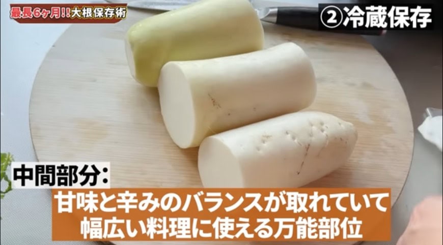大根は部位によって味が大きく違います。部位ごとに切り分けることで料理に合わせて使うことができ、ムダがなくなります。