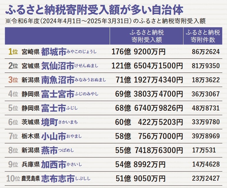 ふるさと納税寄附受入額が多い自治体ランキング BEST10