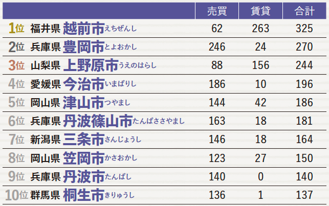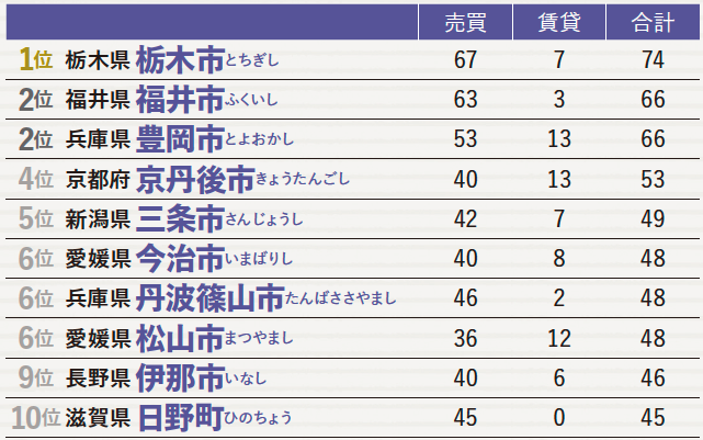 また、売買物件では246件で2位の兵庫県豊岡市がトップ10のなかでも目立った存在になっています。
