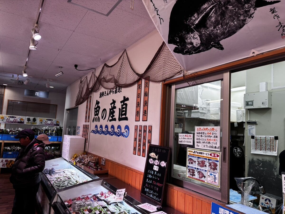 直売所には、その日に水揚げされた新鮮な魚介類が並び、地元価格で購入できるのもうれしいポイント。