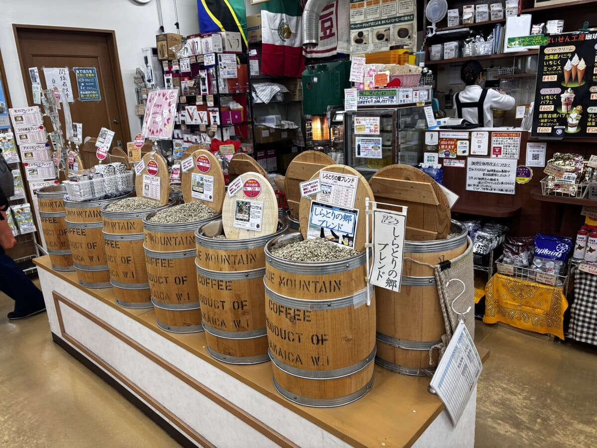 なかでも「タケル館」は見どころが豊富。はびきの名物の「かすうどん」をはじめ、入口にコーヒー豆入りの樽が並ぶ、世界の珈琲豆を扱うコーヒーショップ、こだわりの卵を使っただし巻き卵など、食欲をそそるラインナップがそろいます。
